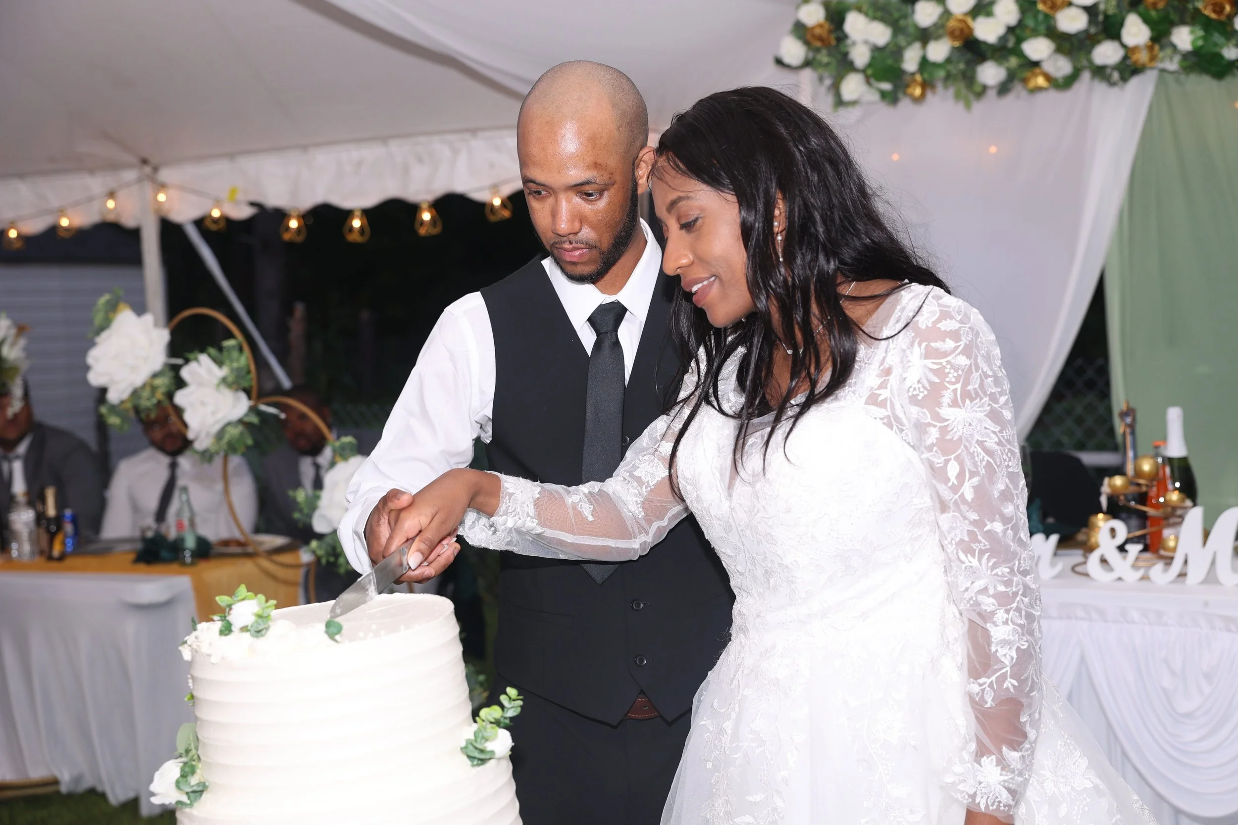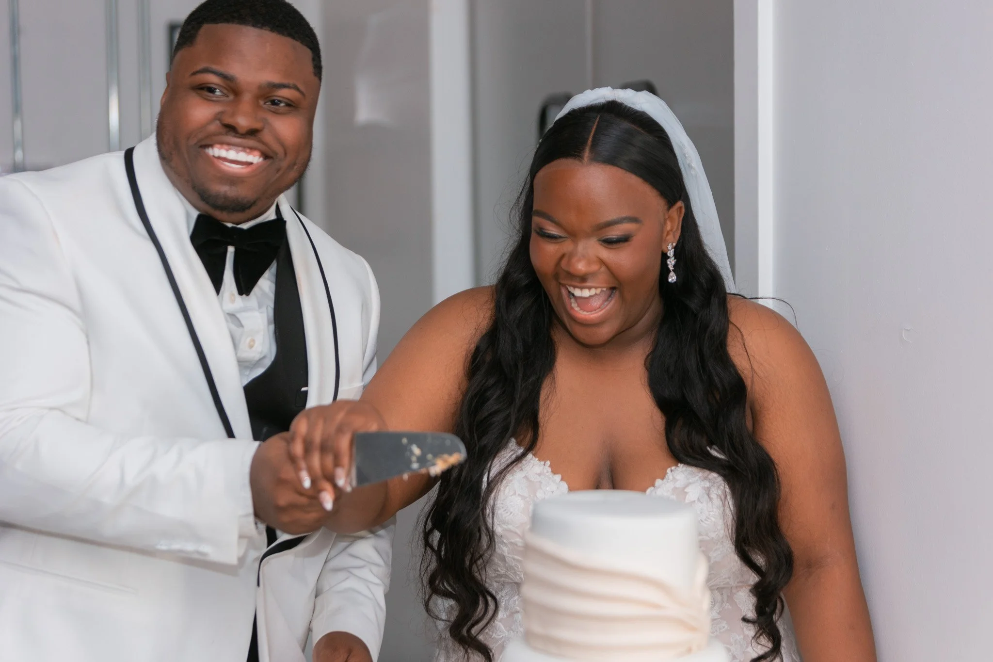 A groom and bride cutting their wedding cake together, the bride wearing a white wedding dress and the groom in a white tuxedo with black accents, both smiling.
