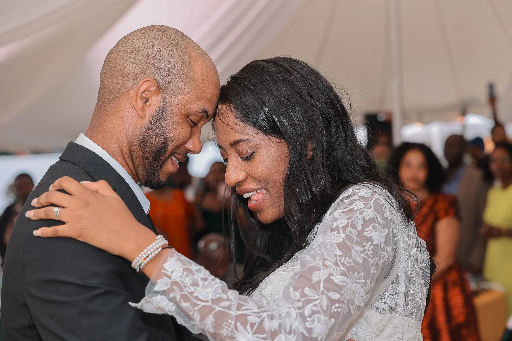 A bride and groom touching foreheads, holding a bouquet, in a wedding ceremony.