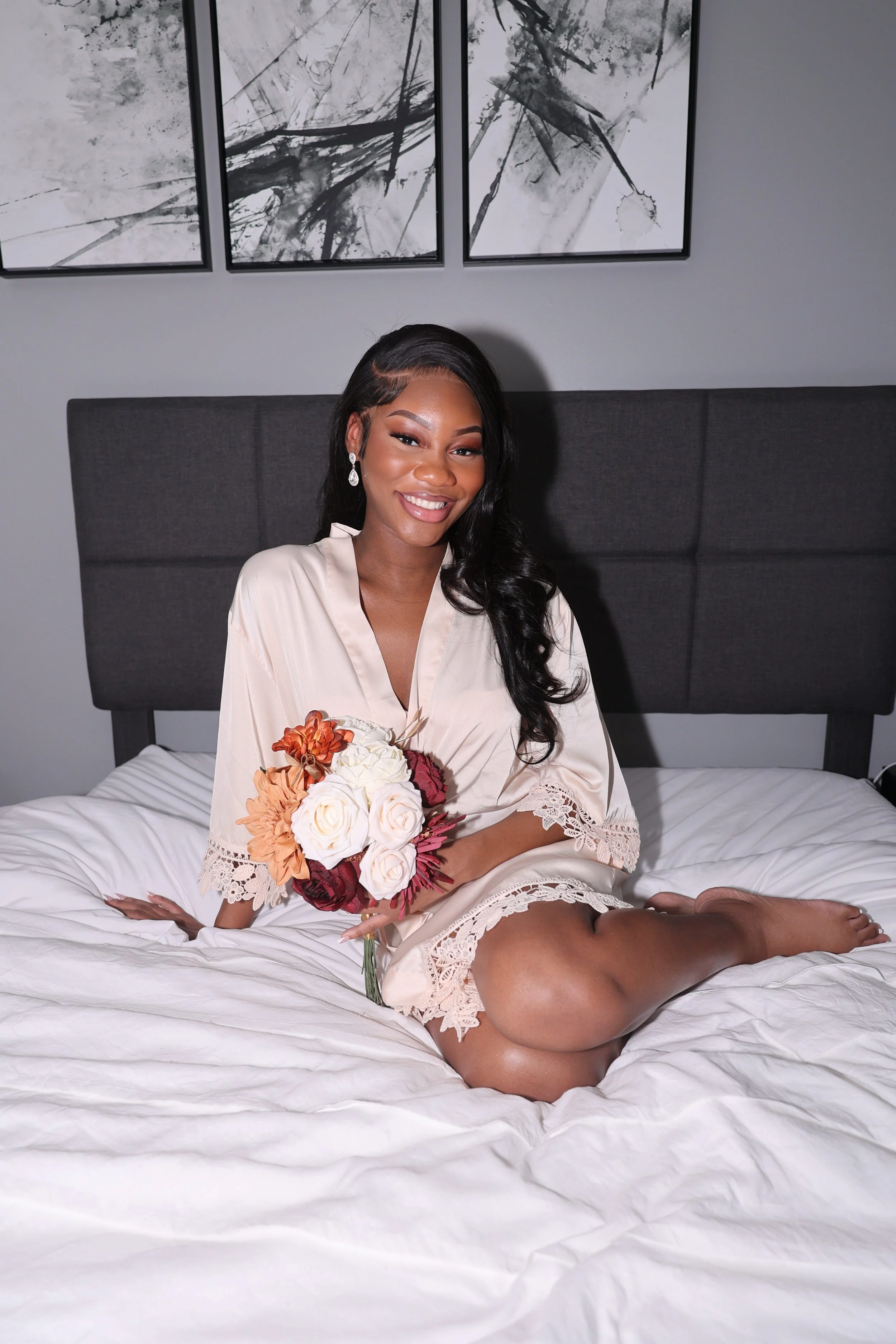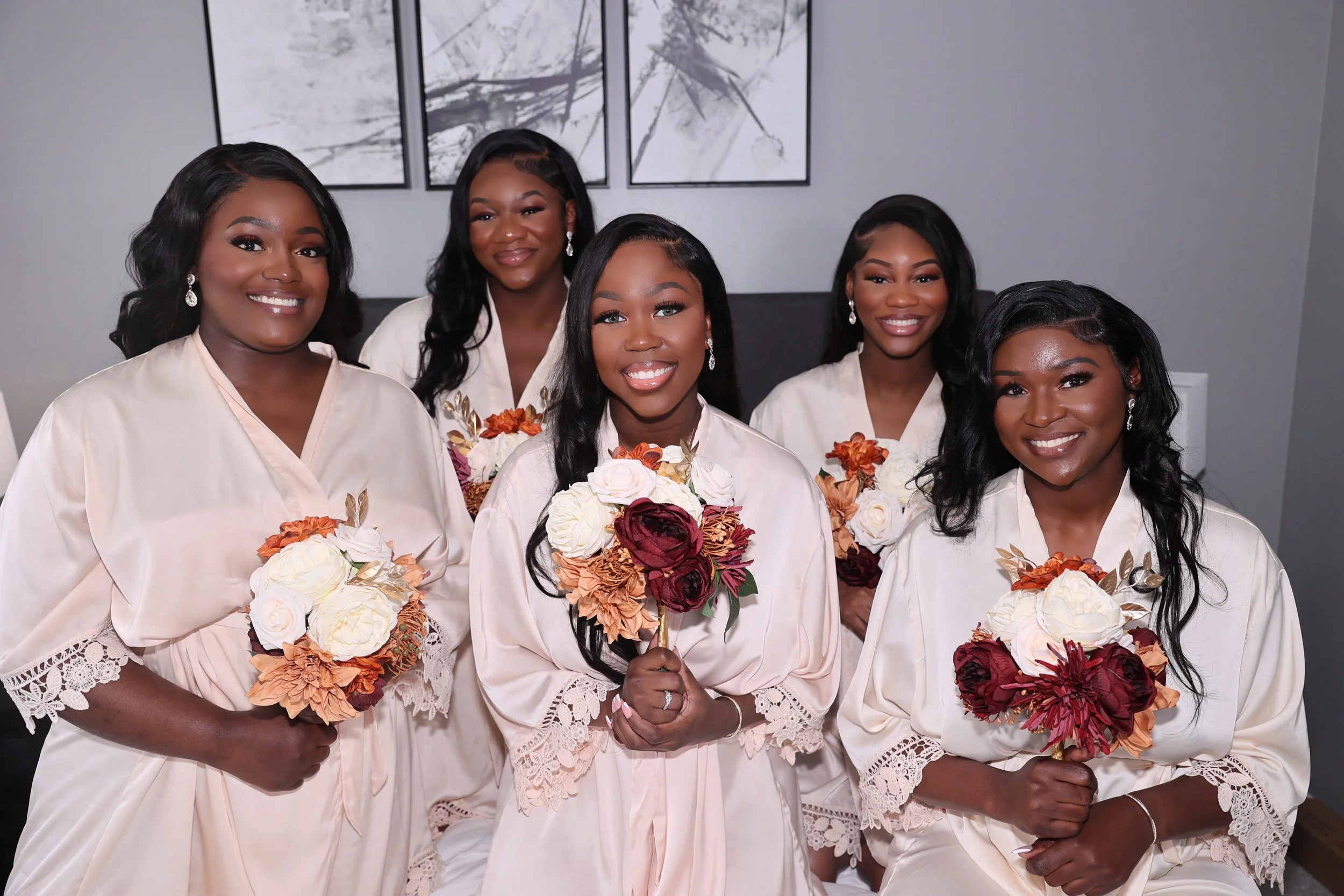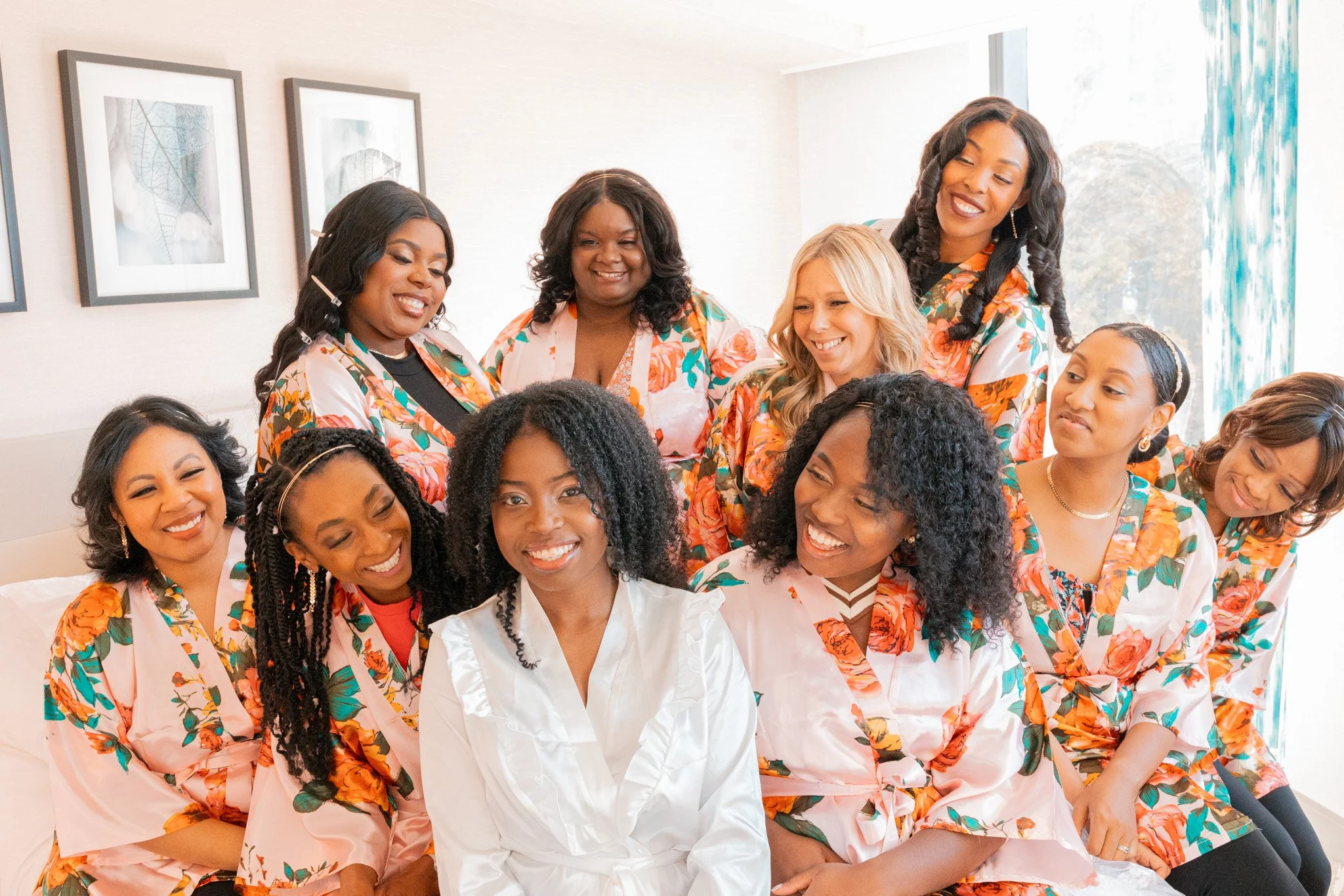 Group of ten women of different ages and ethnicities, dressed in matching floral robes, posing indoors with a bright window in the background.