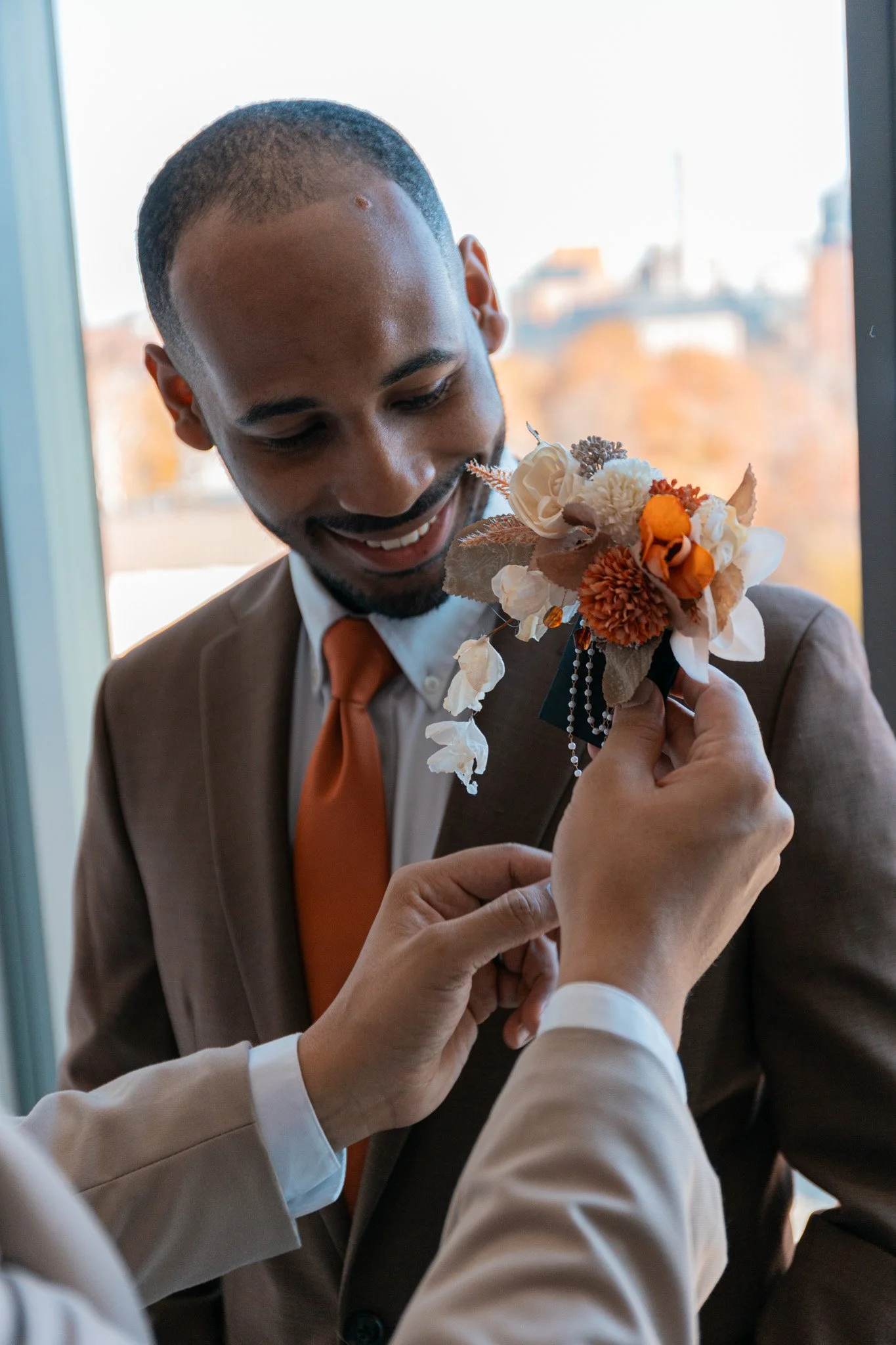 A man in a suit and tie is smiling while a hand pins a floral boutonniere onto his lapel.