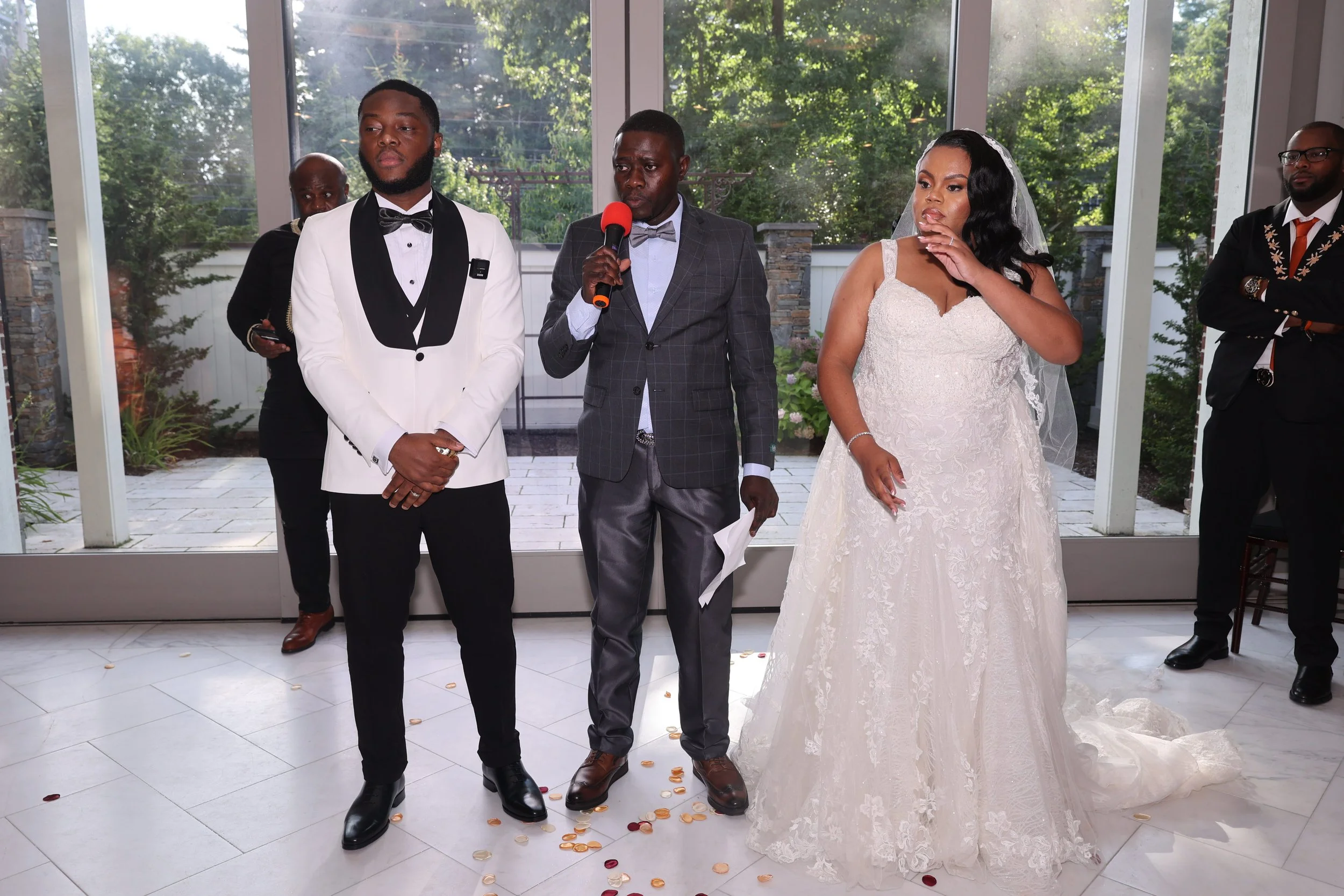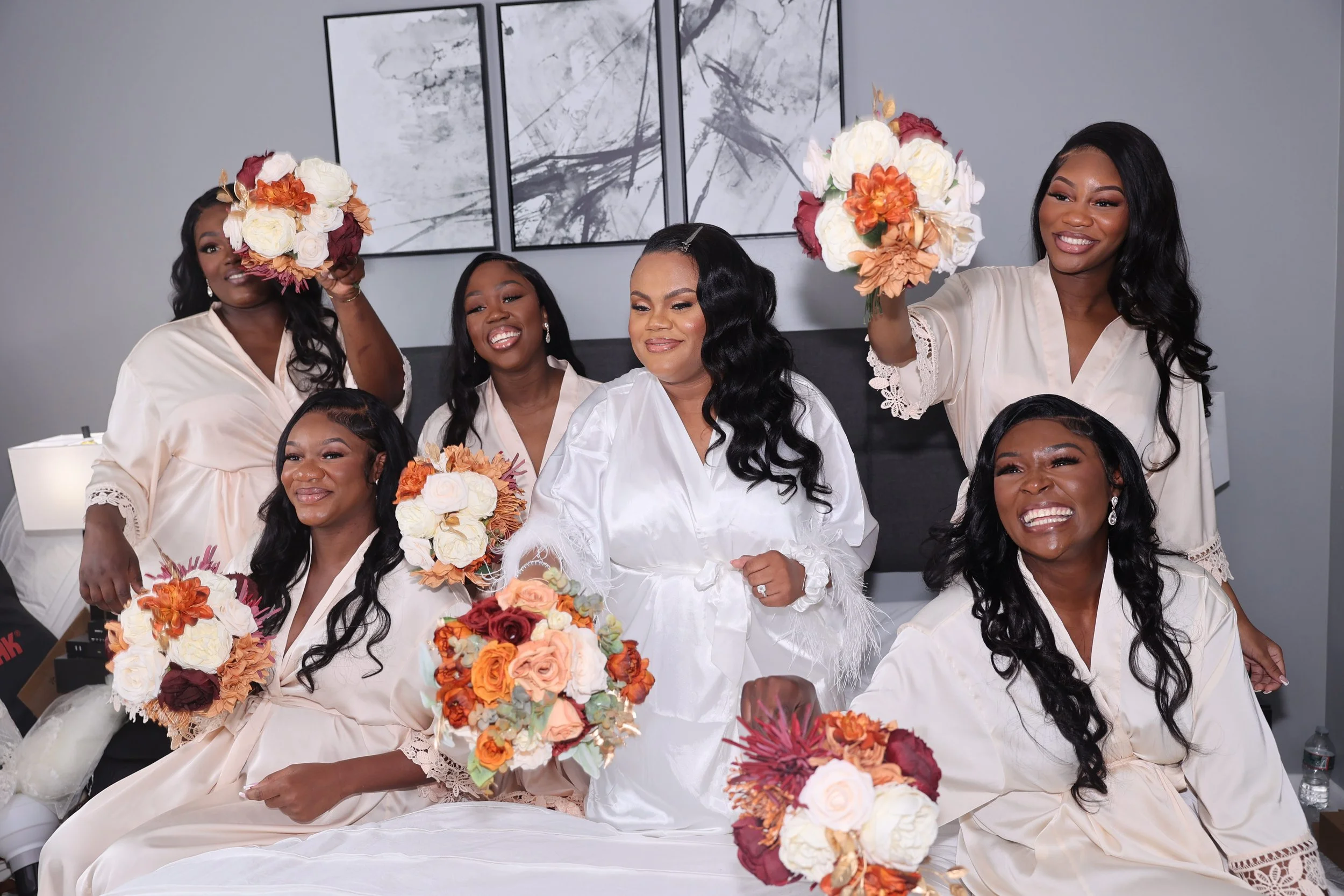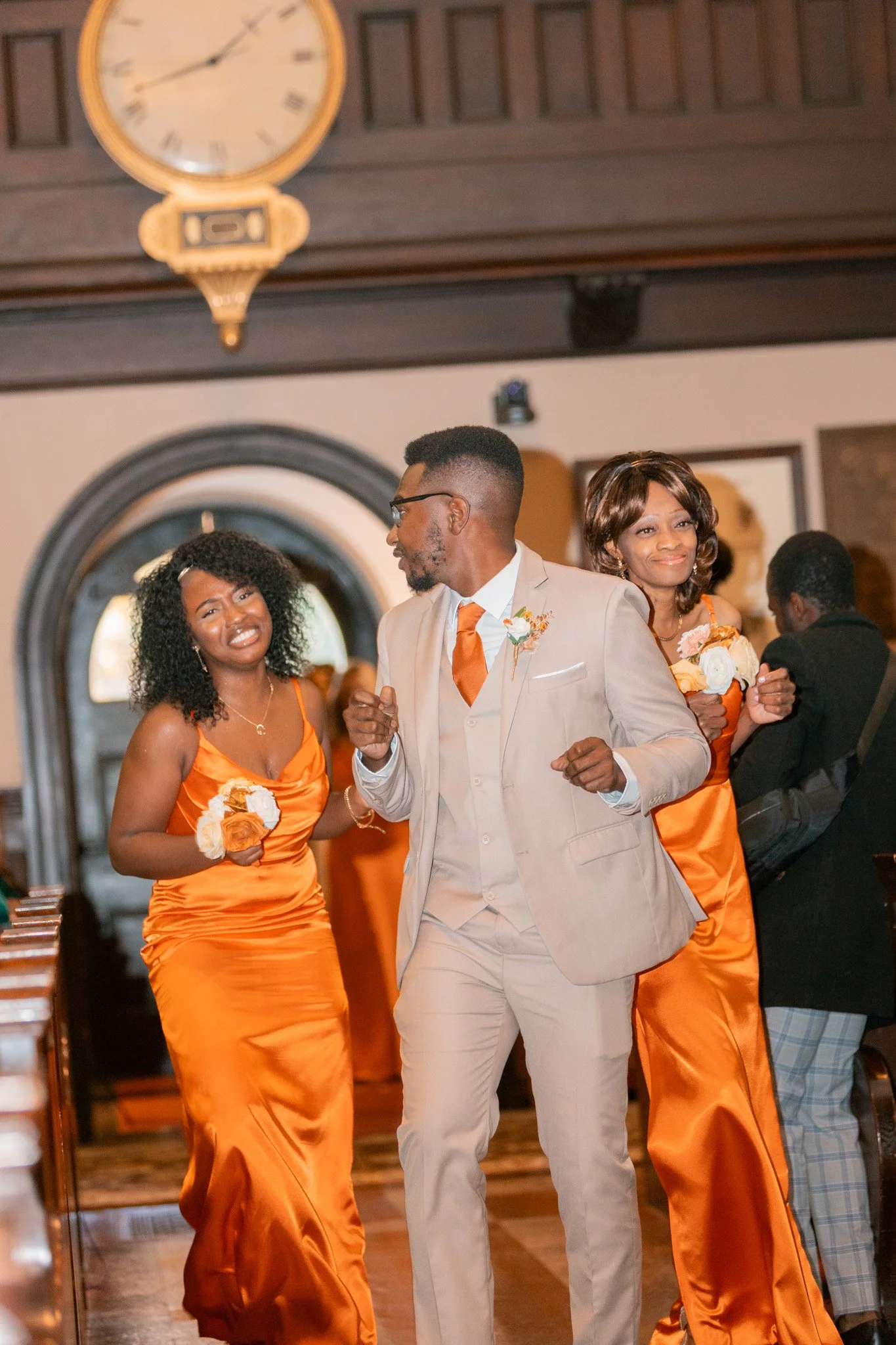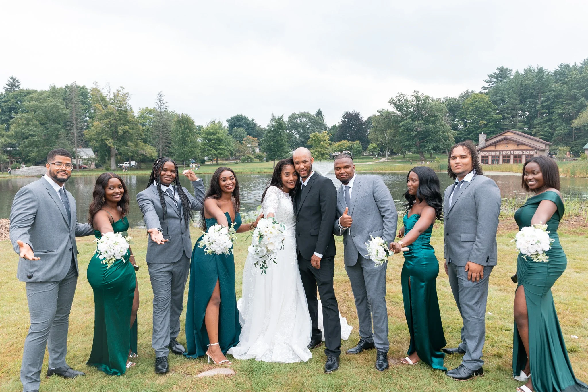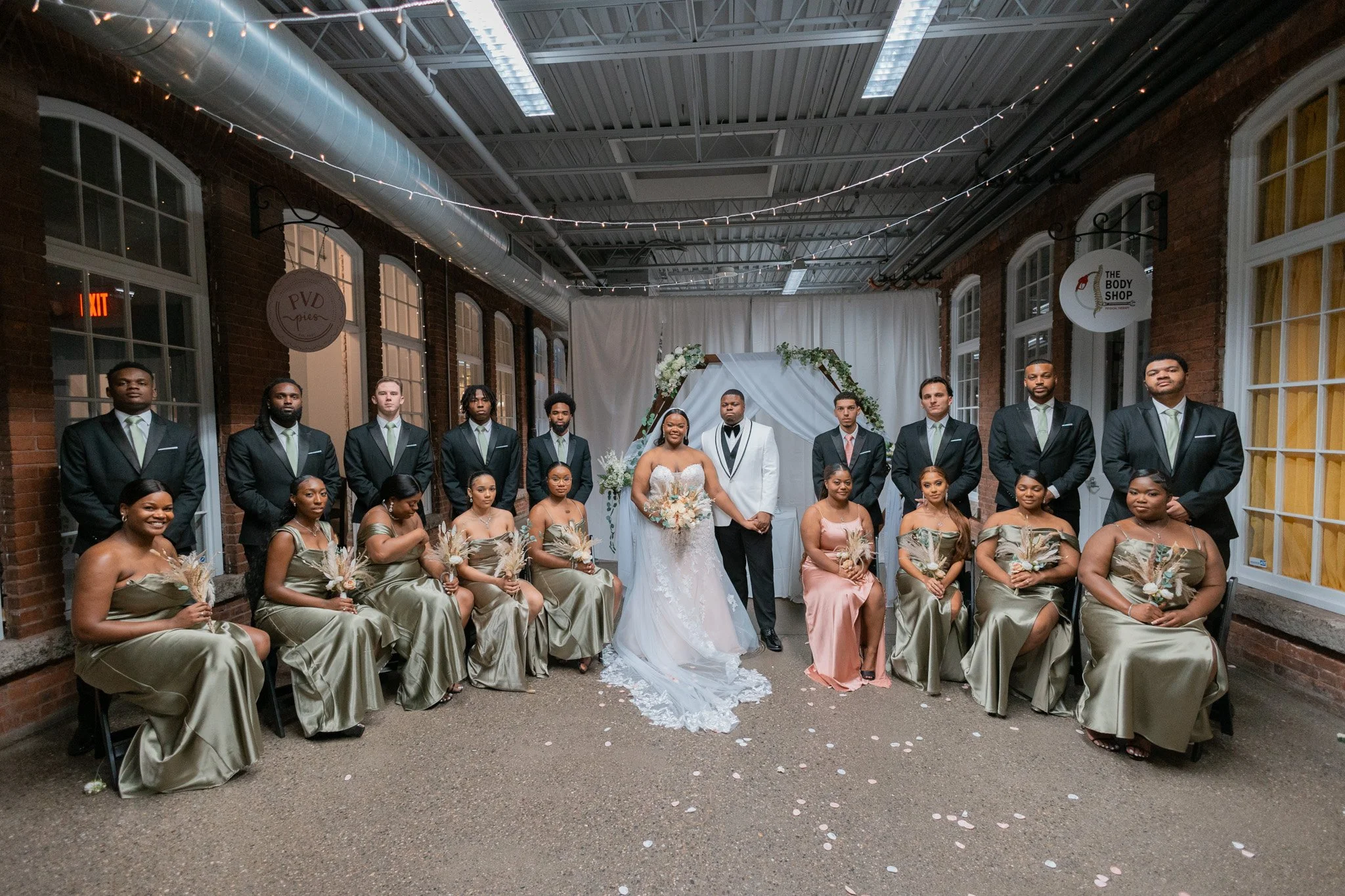 A wedding party with the bride and groom standing in the center, surrounded by their bridesmaids and groomsmen in a decorated indoor venue.