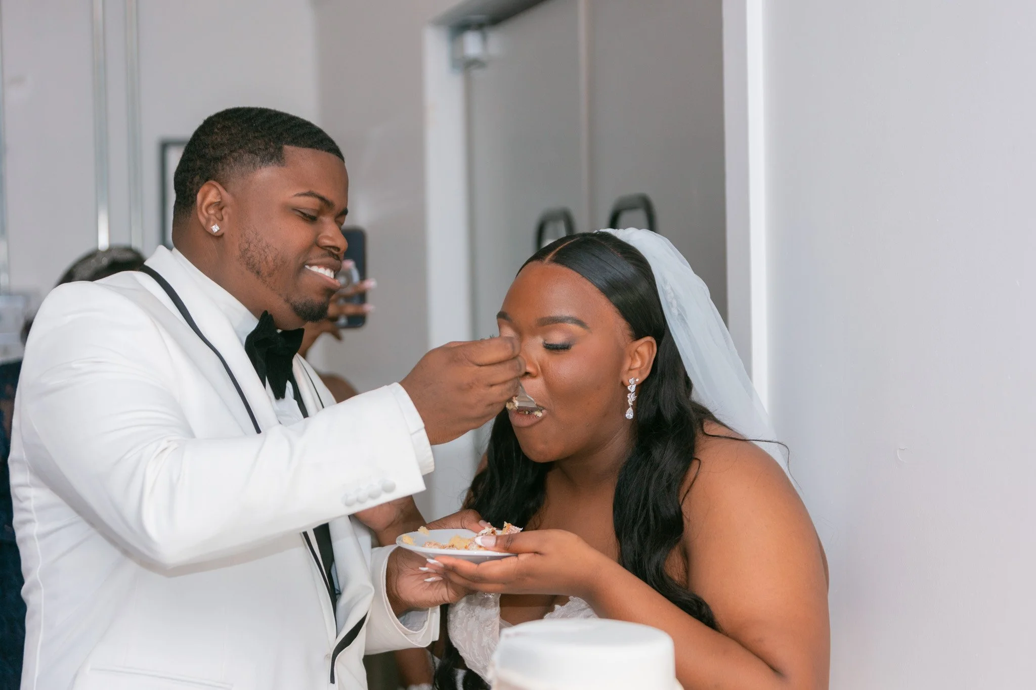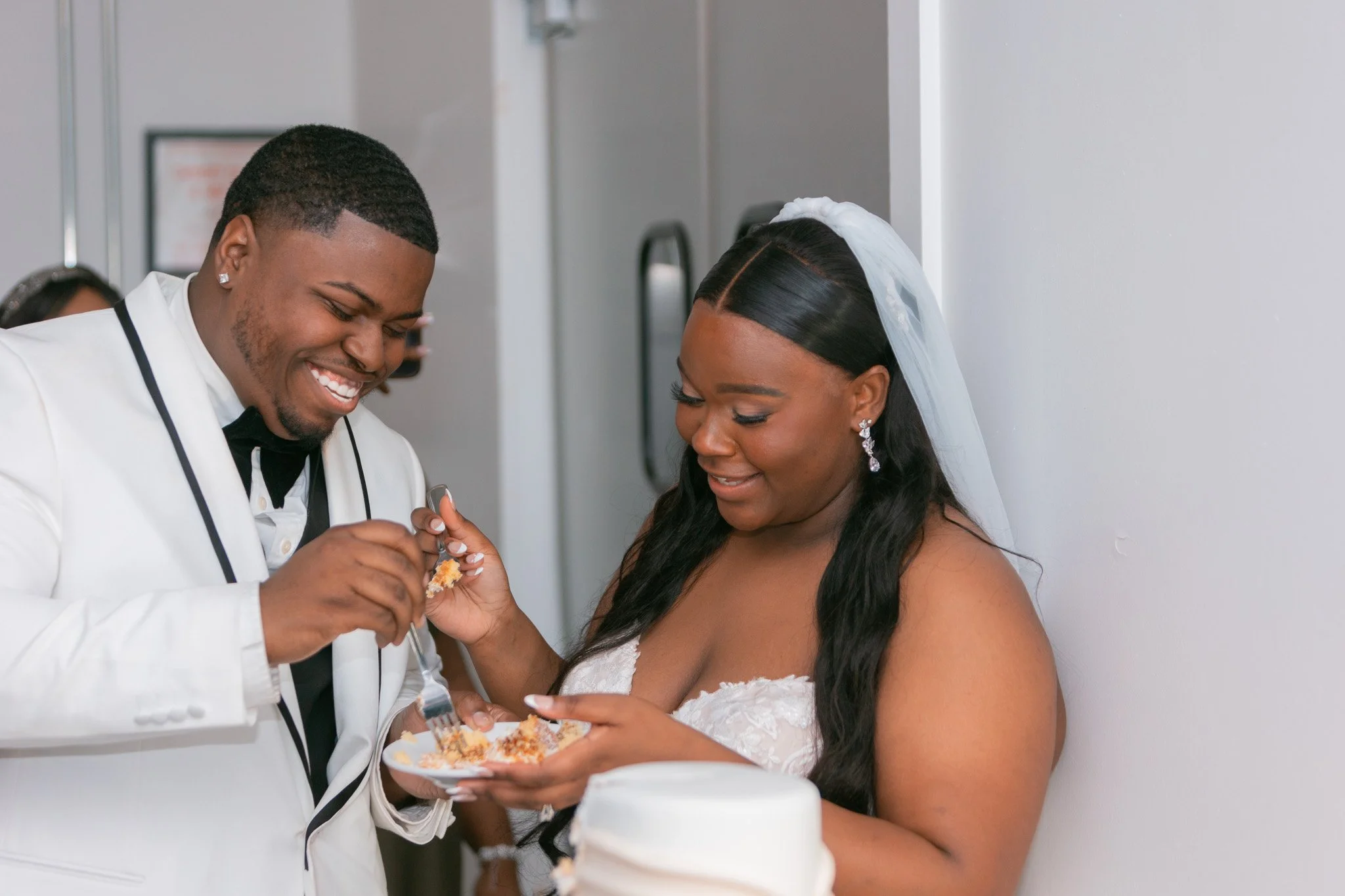A joyous bride and groom sharing a piece of wedding cake together, smiling and enjoying their celebration.