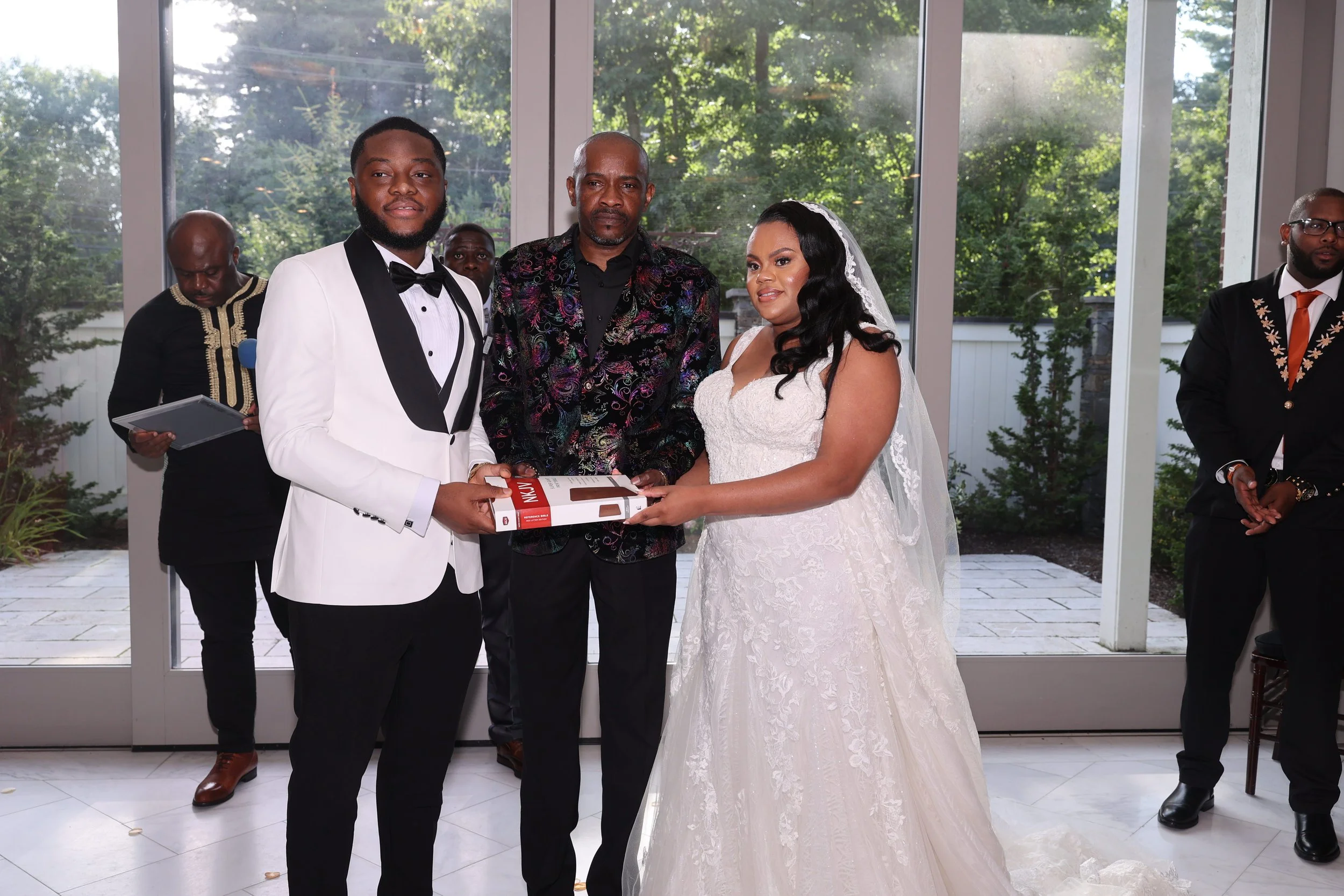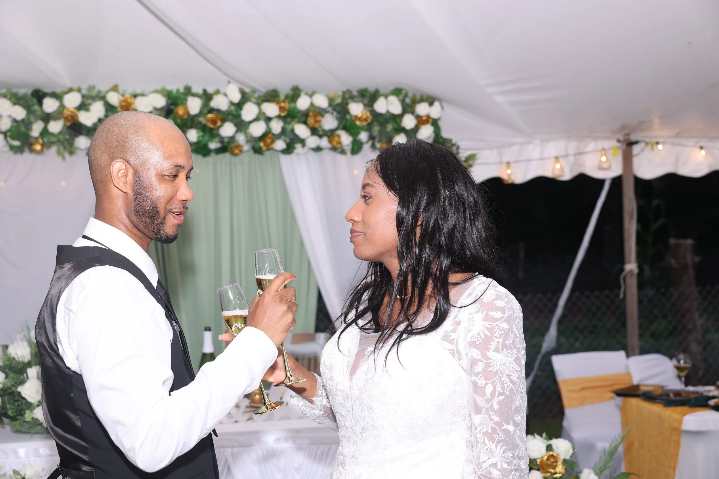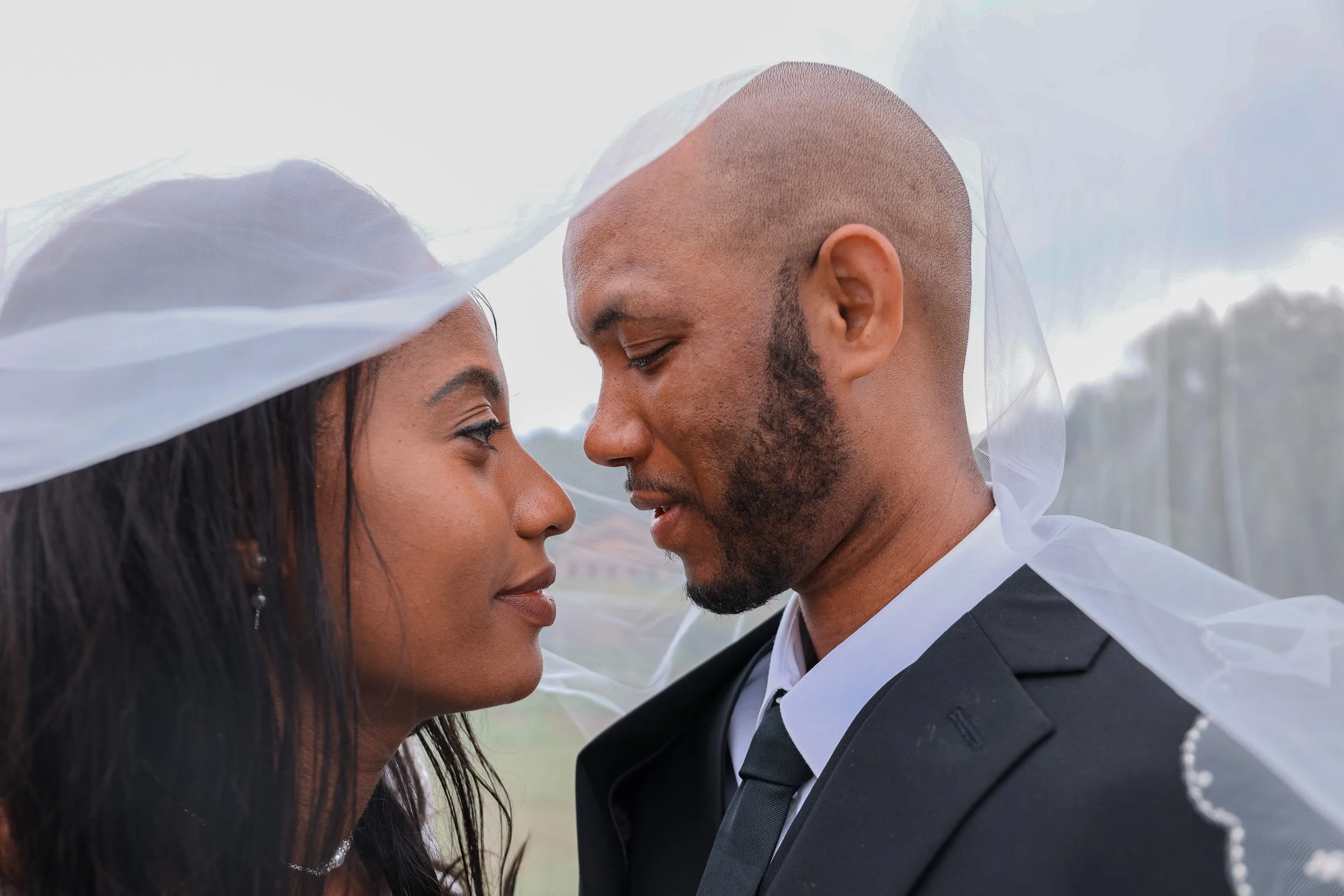 A bride and groom at a wedding reception, with the bride wearing a veil and earrings, and the groom in a white tuxedo with a black bow tie, standing near a wedding cake.