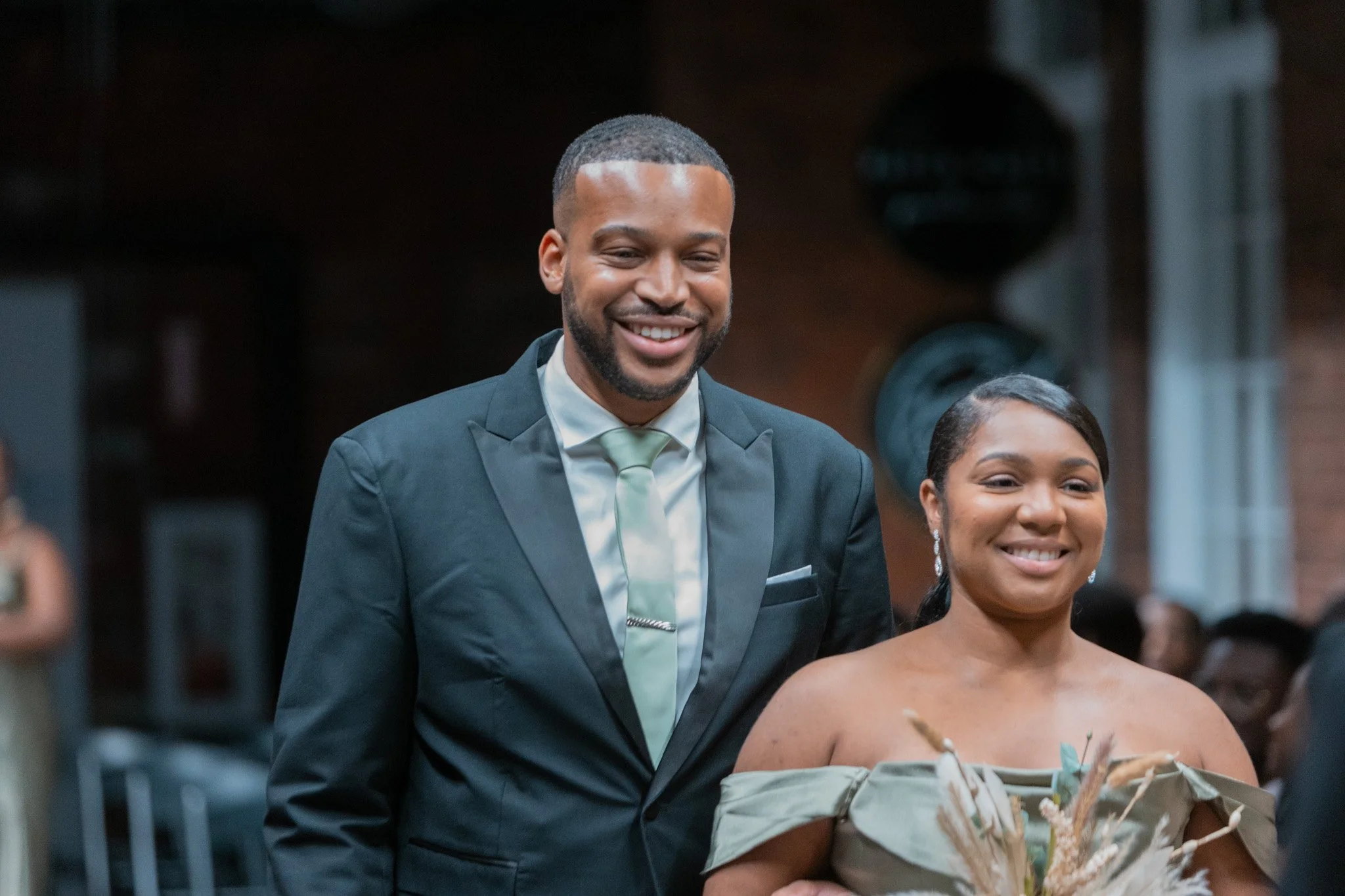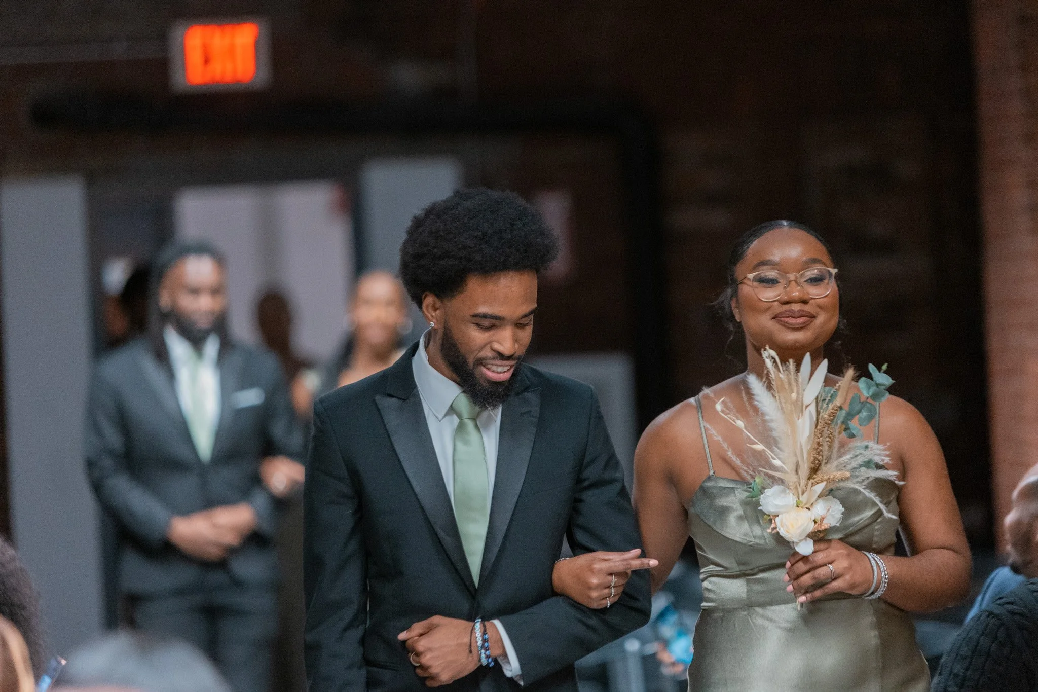 A man and woman walk together, holding arms at a formal event, with the man dressed in a black suit and pastel green tie, and the woman wearing a satin dress and holding a bouquet of flowers, with a blurred background of other people and a brick wall