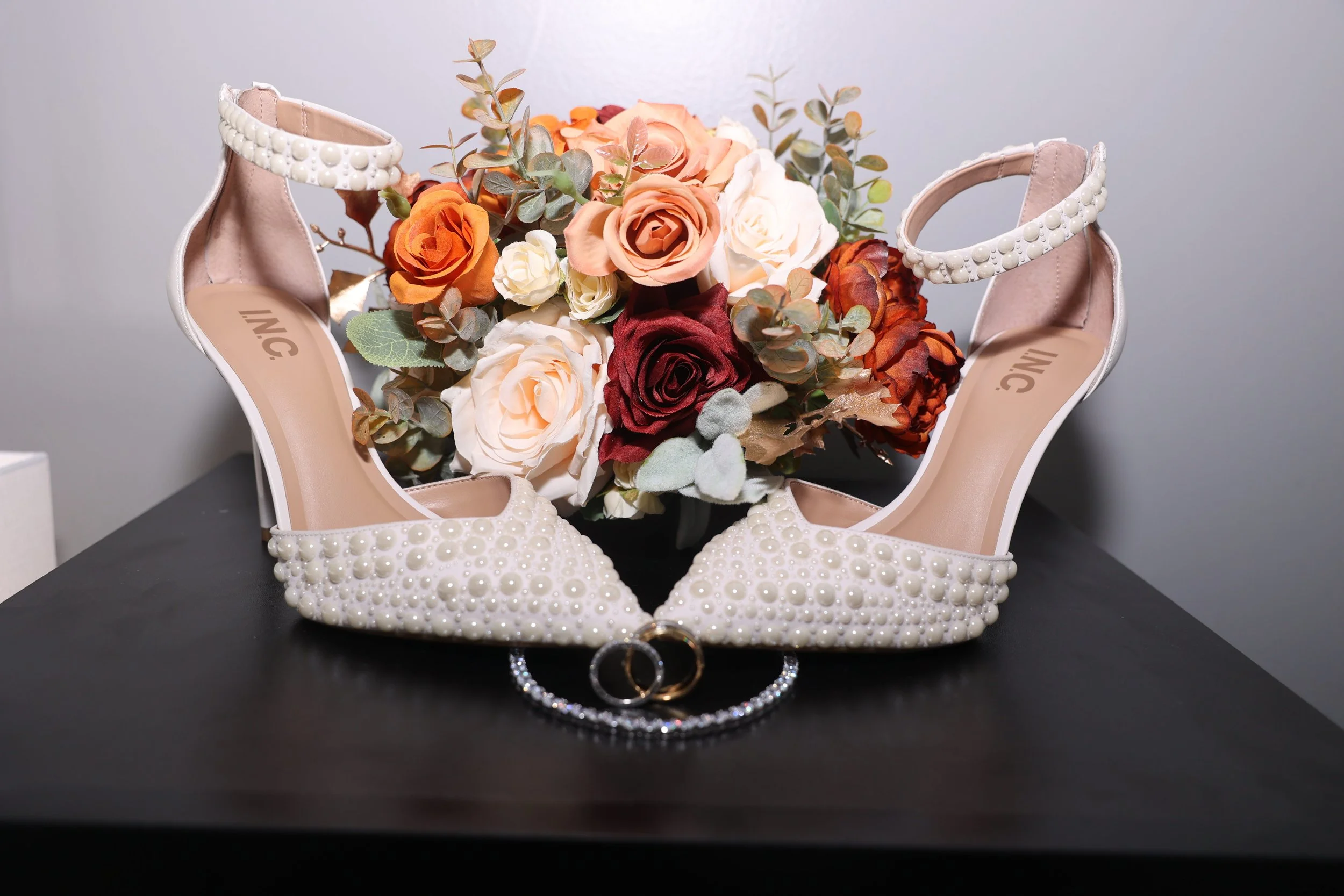 A pair of white high-heeled shoes, a diamond necklace, and matching diamond earrings are arranged on a light wooden surface. The shoes have a textured, snakeskin pattern, and the jewelry features clustered, round diamonds. Sunlight casts shadows on t